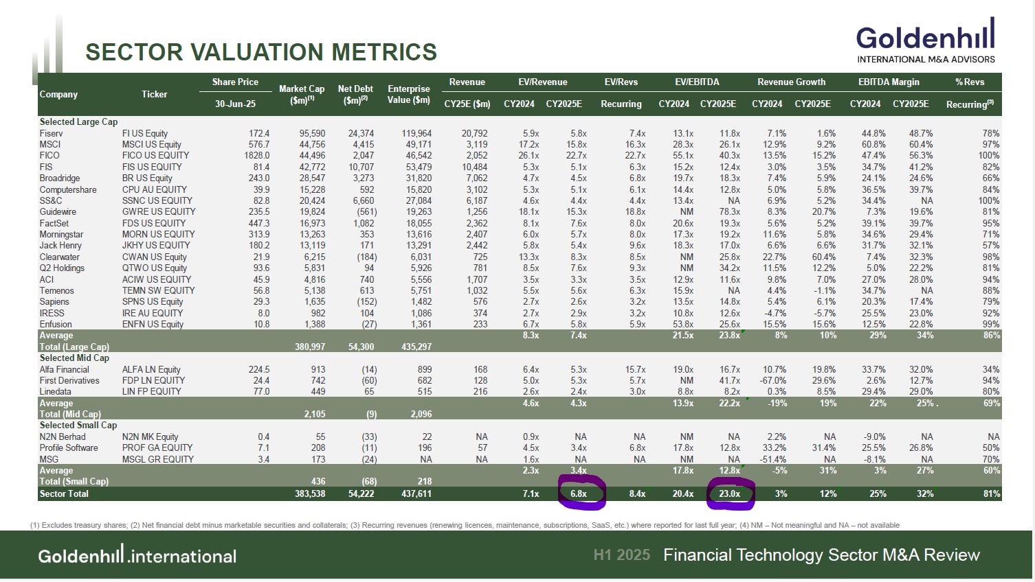 Η Profile διαθέτει 75% περίπου recurring και διψήφιο ρυθμό αύξησης πωλήσεων, άρα το gap αξιολόγησης είναι πλέον προφανές. Από τον πυρήνα των μεγάλων εταιρειών – FICO, MSCI, Guidewire, FactSet, Broadridge, Clearwater – η μέση αποτίμηση τρέχει με EV/EBITDA 23–25x. Η Profile έχει 12–13x στο ταμπλό. Η διαφορά αυτή είναι το καύσιμο της μεγάλης ανόδου του ομίλου.
