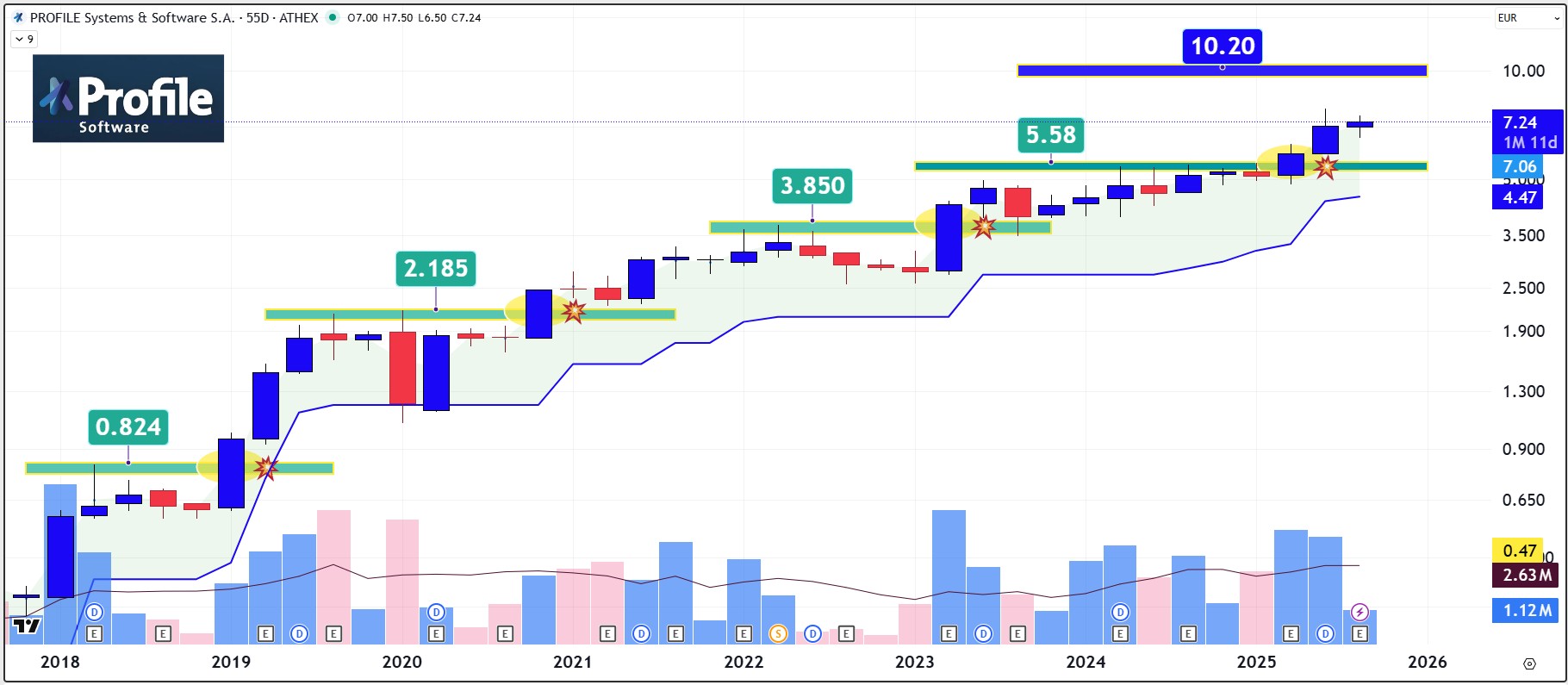 Επίσης σε όρους Rule of 40, η Profile βρίσκεται πάνω από το όριο του 50%, επομένως ανήκει στη ζώνη premium του κλάδου. Αυτό όντως δικαιολογεί πολλαπλασιαστές EV/EBITDA τουλάχιστον 23x, που όπως προαναφέραμε αν εφαρμοστούν στην αναμενόμενη κερδοφορία 2025, οδηγούν σε αξία άνω των €320 εκατ. και τιμή μετοχής κοντά στα €13 ενώ σε αυτή του 2026 η τιμή της μετοχής εξακοντίζεται στα €20.