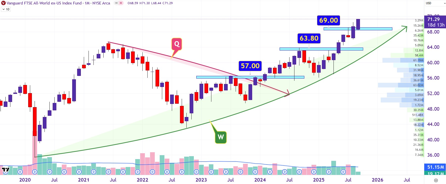 Χαρακτηριστική είναι η περίπτωση της διαγραμματικής εικόνας του ETF Vanguard FTSE All-World ex-US (VEU) όπου τις τελευταίες μέρες όχι μόνο δεν δείχνει σημάδια πτωτικής διάθεσης αλλά αντιθέτως διαλύει το ένα ιστορικό υψηλό μετά το άλλο φτάνοντας στα 71,30 δολάρια με συνολική απόδοση από τις αρχές του έτους της τάξης του +24,50%.