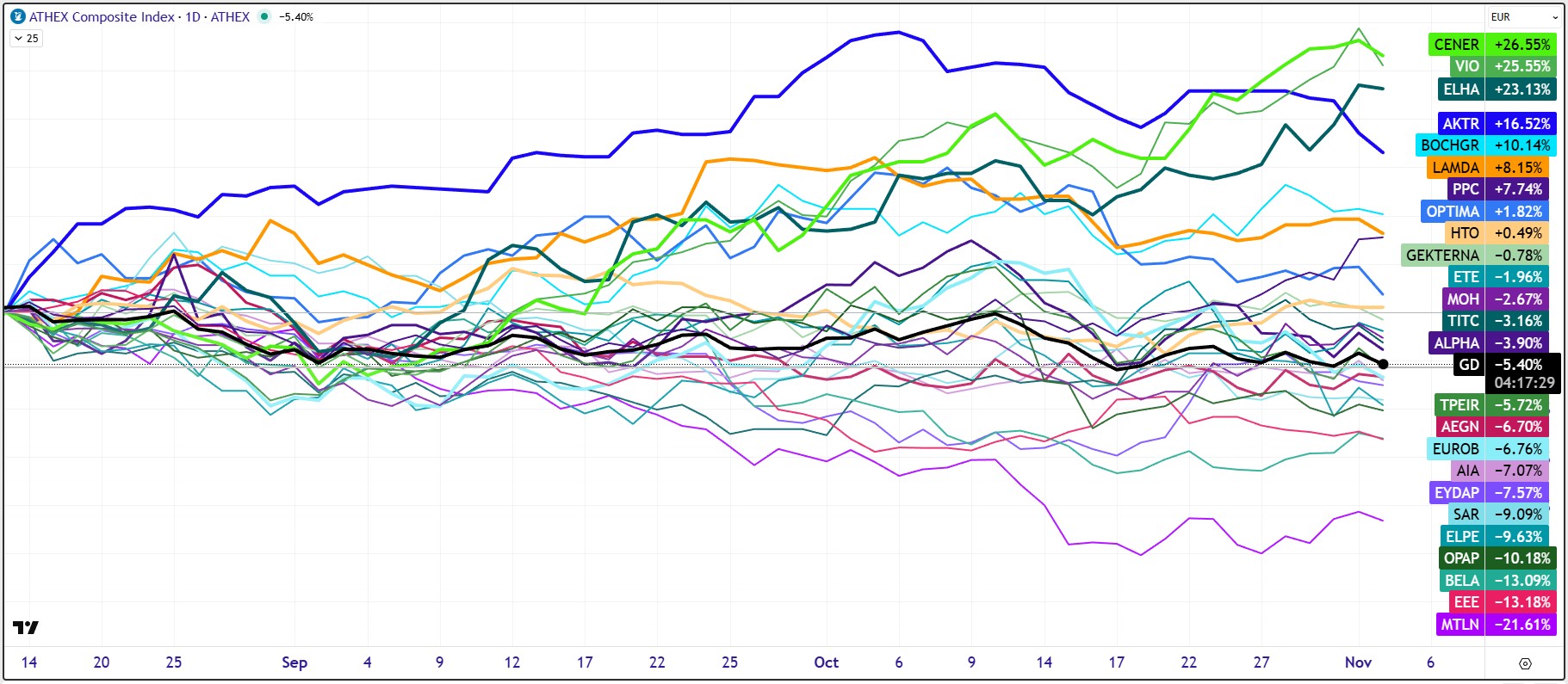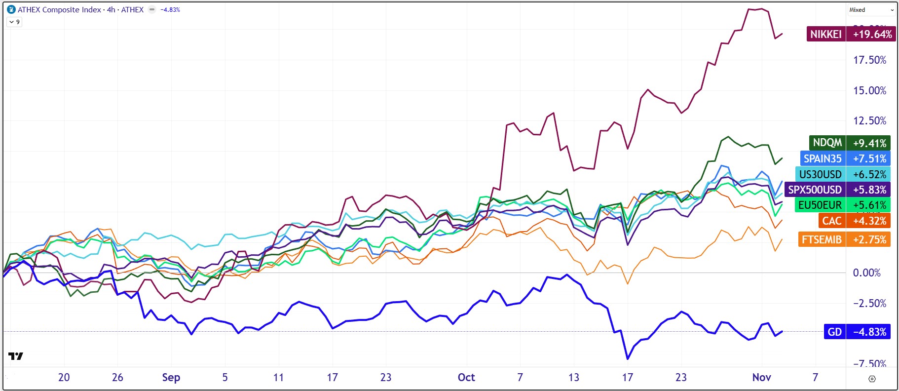 Παράλληλα στη διεθνή σκηνή, η εικόνα αντιπαράθεσης είναι χαρακτηριστική με τη Wall Street να το στρίβει σε ανοδικό κανάλι (Nasdaq 100 +9,40%, S&P 500 +5,80%, Dow +6,50%), την Ευρώπη να είναι σε θετικό βηματισμό (Euro Stoxx 50 +5.6%, CAC +4,3%), την Ιαπωνία να εκτοξεύεται στο +19%, και ο Γενικός Δείκτης να έχει ξεμείνει πίσω στο −4,83%. Δηλαδή παρά τον καλό μας πρότερο ανοδικό βίο από την αρχή της χρονιάς τώρα δείχνουμε σαν να βλέπουμε το έργο από την εξέδρα.