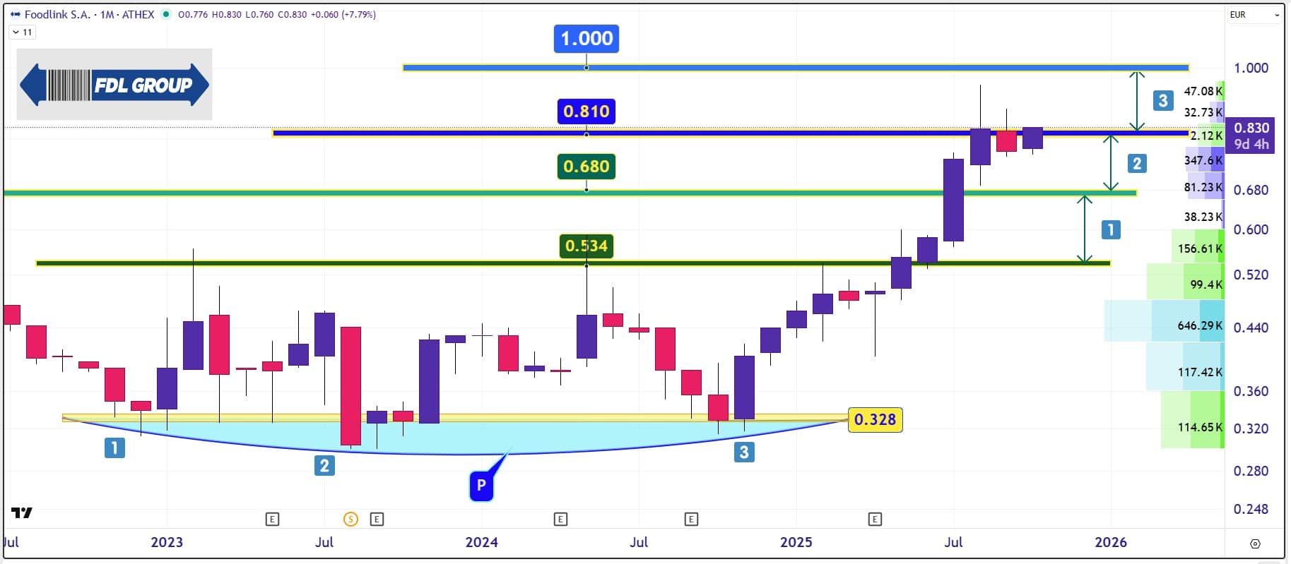 Με βάση το τρέχον επίπεδο των €0,83, το περιθώριο ανόδου φτάνει κοντά στο +180%, υποδηλώνοντας ότι η αγορά εξακολουθεί να αποτιμά τη Foodlink πολύ κάτω από την πραγματική επιχειρηματική της αξία. Η απόσταση από το 4x στο 9x EV/EBITDA είναι σχεδόν σίγουρο ότι θα καλυφθεί κατά ένα μεγάλο μέρος με την είσοδο του ομίλου στην Κύρια Αγορά του ελληνικού χρηματιστηρίου το 2026.