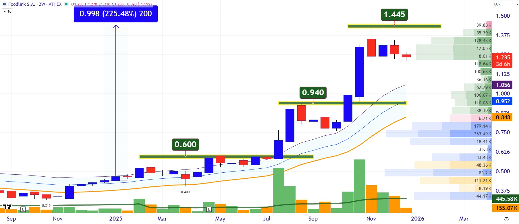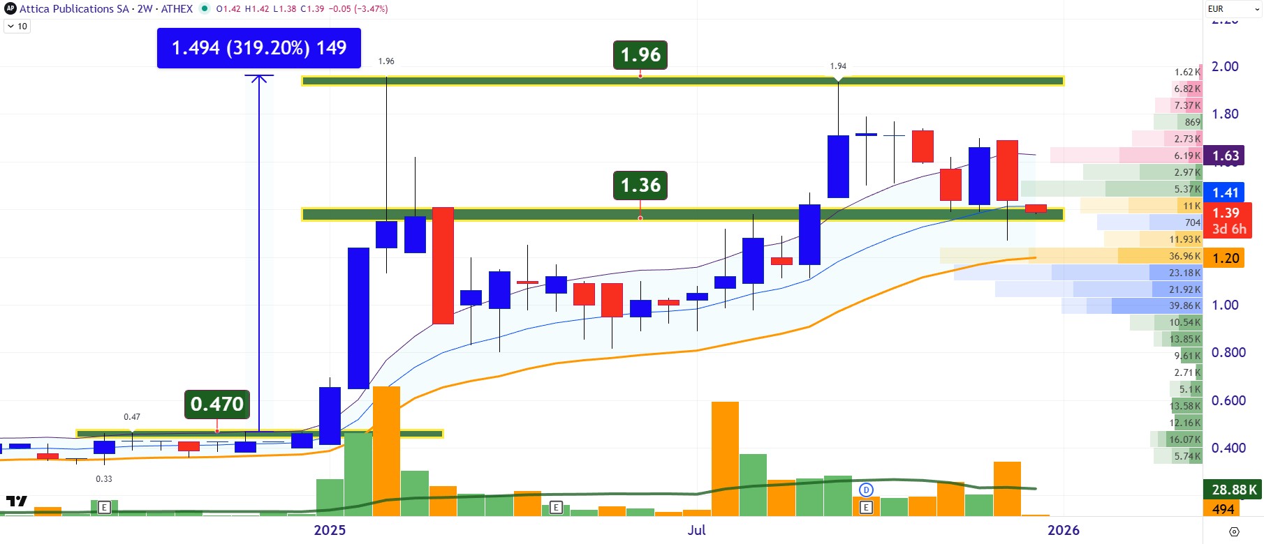 Οι Αττικές Εκδόσεις (ΑΤΕΚ) κατέγραψαν από τις υψηλότερες αποδόσεις της χρονιάς. Η μετοχή είδε μέσα στο 2025 κέρδη έως +319%, ενώ πάει να κλείσει το έτος, μιας που το άρθρο γραφόταν στις 30 Δεκεμβρίου, με ένα +196%, κατακτώντας τη δεύτερη θέση σε ποσοστιαία άνοδο στο Euronext Athens. Η αγορά ουσιαστικά ξανακοίταξε έναν όμιλο που για χρόνια βρισκόταν εκτός ραντάρ. Έναν όμιλο όμως που άντεξε, προσαρμόστηκε και ξαναβρήκε βηματισμό. Στο πρώτο εξάμηνο 2025 οι Αττικές Εκδόσεις εμφάνισαν κύκλο εργασιών 10,72 εκατ. ευρώ, με τα καθαρά κέρδη να διαμορφώνονται στα 1,07 εκατ., ενώ η μητρική εταιρεία κατέγραψε άλμα καθαρής κερδοφορίας +75%, στα 0,87 εκατ. ευρώ. Το μικτό περιθώριο παραμένει πάνω από 50%, το χρηματοοικονομικό κόστος υποχωρεί και ο δανεισμός αναδιαρθρώνεται σε μακρύτερο ορίζοντα. Η ουσία, όμως, εδώ είναι η επιστροφή της μετοχικής αξιοπιστίας σε έναν παραδοσιακό media όμιλο που επενδύει σε ψηφιακά μέσα, ραδιόφωνο και νέες μορφές διαφημιστικής εκμετάλλευσης. Σε έναν κλάδο που άλλαξε βίαια την τελευταία δεκαετία, οι Αττικές Εκδόσεις δείχνουν ότι έχουν βρει ρυθμό και η αγορά έχει αρχίσει και προεξοφλεί σταδιακά ότι το σενάριο αντοχής έχει ξανά μέλλον. Διαγραμματικά, η μετοχή δείχνει στο διεβδομαδιαίο chart ότι θέλει να πατήσει πάνω στη βάση των αγοραστών στα 1,36 με 1,28 ευρώ, ώστε να ξαναπάρει τον ανηφορικό δρόμο προς την περιοχή των 2,00 ευρώ.