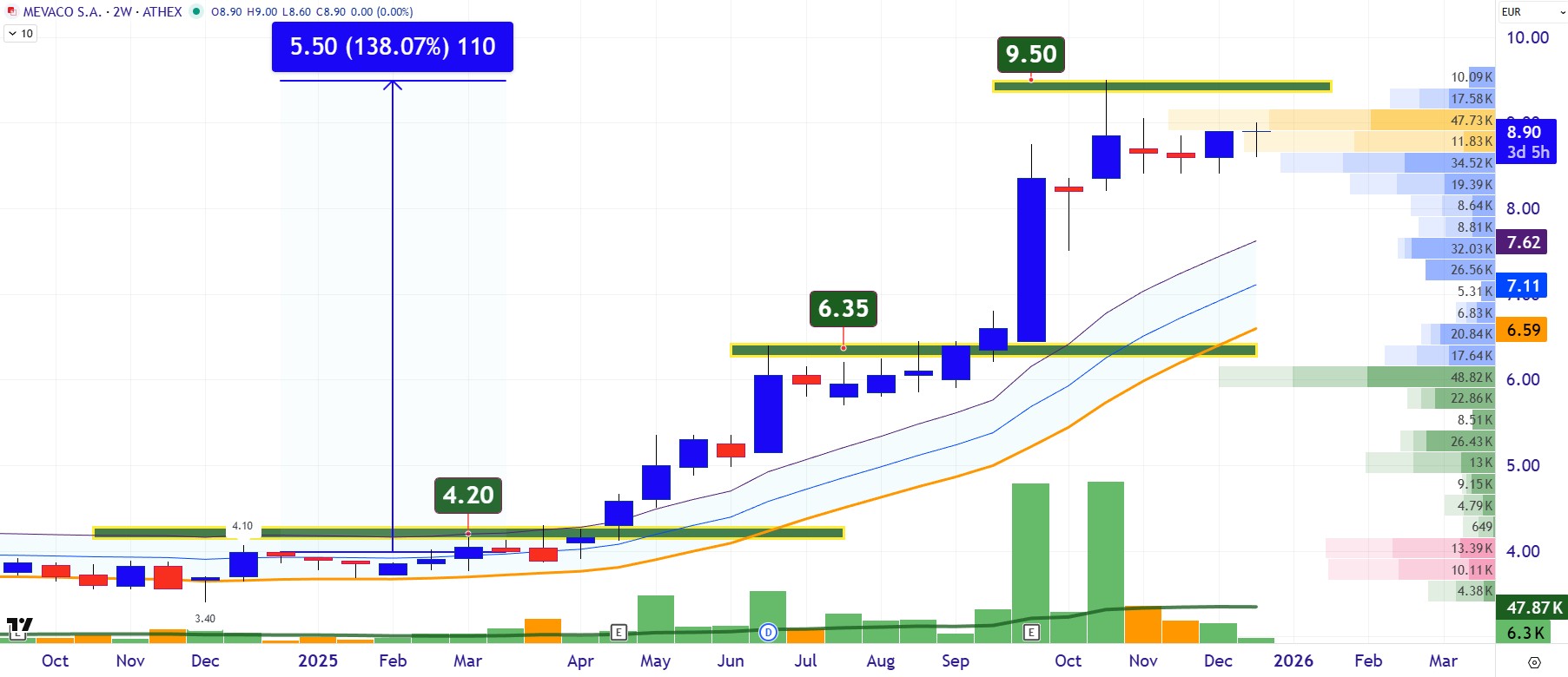 Η Mevaco (ΜΕΒΑ) συγκαταλέγεται φέτος στις μετοχές που ξεχώρισαν πραγματικά στο ταμπλό. Μέσα στο 2025 έφτασε να καταγράφει άνοδο έως +138%, ενώ λίγο πριν από την ολοκλήρωση της χρονιάς διατηρεί κέρδη +123%, επίδοση που τη φέρνει στις υψηλότερες αποδόσεις του έτους. Η χρηματιστηριακή εικόνα συνδέεται άμεσα με τα οικονομικά μεγέθη. Στο πρώτο εξάμηνο 2025 ο κύκλος εργασιών ανήλθε σε 49,22 εκατ. ευρώ (+207%), τα EBITDA διαμορφώθηκαν στα 10,21 εκατ. ευρώ (+425%) και τα καθαρά κέρδη στα 7,43 εκατ. ευρώ (+622%). Το περιθώριο EBITDA έφτασε το 20,7% και το καθαρό περιθώριο το 15,1%, επίπεδα που δείχνουν ισχυρό έλεγχο κόστους και παραγωγής. Η Mevaco λειτουργεί με καθαρό ταμείο 9,67 εκατ. ευρώ, χρηματοδοτώντας τις επενδύσεις της αποκλειστικά από ίδια κεφάλαια. Το ανεκτέλεστο έργων 41 εκατ. ευρώ προσφέρει ορατότητα τουλάχιστον διετίας, ενώ η δραστηριότητα απλώνεται πλέον σε ΑΠΕ, αμυντικές εφαρμογές και σύνθετα κατασκευαστικά έργα υψηλών απαιτήσεων. Διαγραμματικά, η μετοχή έχει διαλύσει ανοδικά τα 4,20 και τα 6,35 ευρώ και τώρα δείχνει ότι ετοιμάζεται να διαλύσει ανοδικά και το φράγμα των 9,50 με 10 ευρώ, βάζοντας ως επόμενο στόχο τα 10,80 με 11,20 ευρώ.