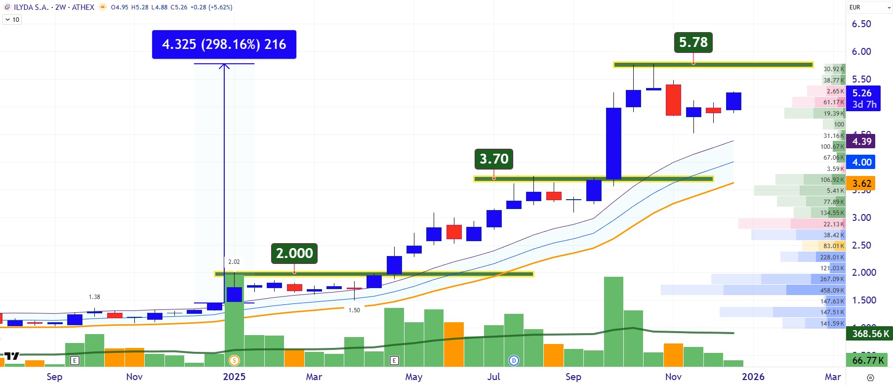Η ΙΛΥΔΑ Πληροφορική (ΙΛΥΔΑ) είναι αδιαμφισβήτητα η μετοχή με την υψηλότερη απόδοση του 2025, καταγράφοντας άνοδο +298%, με την τιμή να φτάνει τα 5,78 ευρώ. Η εικόνα αυτή στηρίζεται πάνω σε μετρήσιμα αποτελέσματα, καθώς στο πρώτο εξάμηνο του 2025 ο κύκλος εργασιών ανήλθε σε 4,51 εκατ. ευρώ (+59,9%), τα καθαρά κέρδη σε 1,59 εκατ. ευρώ (+38,7%) και το EBITDA σε 2,12 εκατ. ευρώ, ενώ τα ταμειακά διαθέσιμα υπερδιπλασιάστηκαν στα 5,29 εκατ. ευρώ, με μηδενικό τραπεζικό δανεισμό. Η διοίκηση ξεκαθαρίζει ότι η τρέχουσα επίδοση δεν αποτελεί “ταβάνι”, αλλά αποτέλεσμα ωρίμανσης ενός μοντέλου που βασίζεται σε πολυετή έργα, υψηλό ανεκτέλεστο και οργανωτική επάρκεια. Η ρευστότητα προσφέρει στρατηγική ευελιξία, χωρίς πίεση για βεβιασμένες εξαγορές, ενώ η διεθνής επέκταση εξετάζεται επιλεκτικά σε αγορές με συγκεκριμένο τεχνολογικό προσανατολισμό αλλά υψηλής προστιθέμενης αξίας. Στη διαγραμματική ανάλυση, η μετοχή στο διεβδομαδιαίο chart τιμών φαίνεται να έχει καταστρατηγήσει ανοδικά τα επίπεδα αντιστάσεων των 2 και 3,70 ευρώ και τώρα δοκιμάζει να πυρπολήσει και τη ζώνη των υψηλών στα 5,78 με 5,84 ευρώ, ώστε να κινηθεί προς το όριο των 6 ευρώ. Πάνω από εκεί θα ανοίξει για τα 6,75 ευρώ.