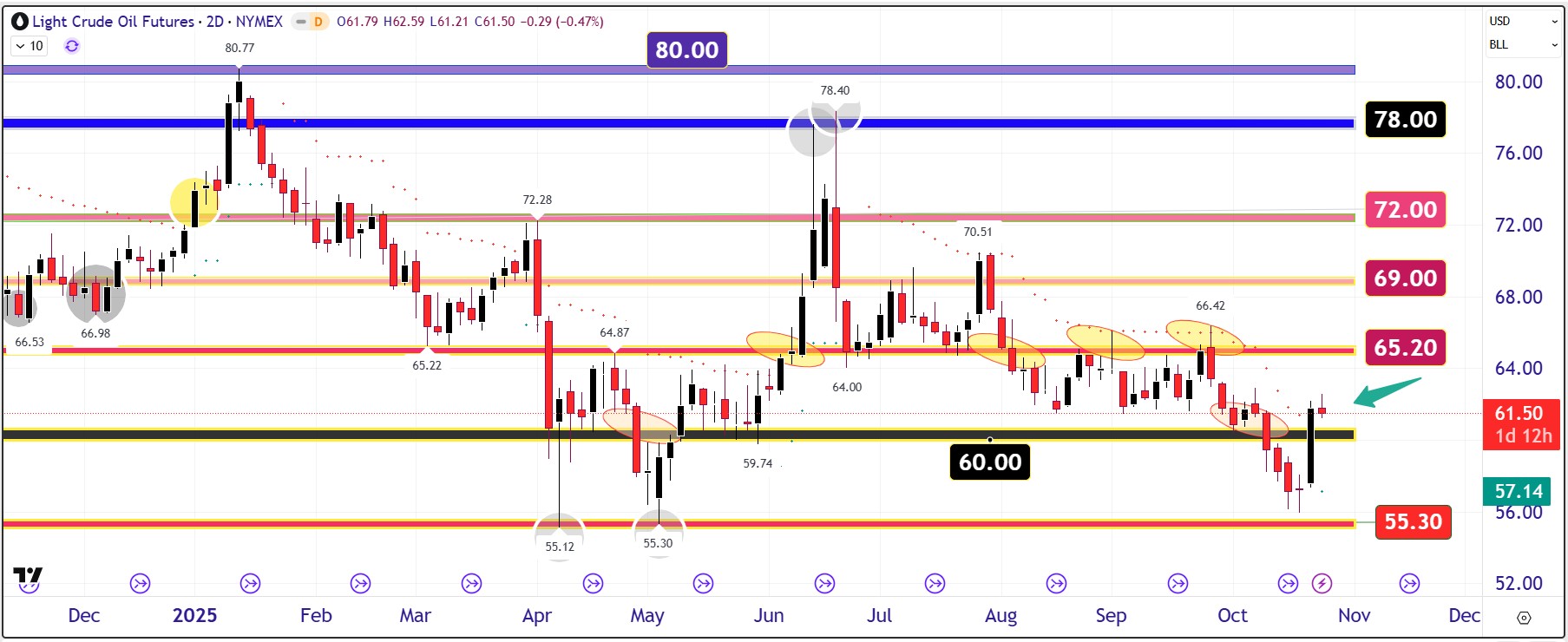 Η αγορά πετρελαίου επέστρεψε ανοδικά μετά την ανακοίνωση των νέων αμερικανικών κυρώσεων σε δύο από τις μεγαλύτερες ρωσικές πετρελαϊκές εταιρείες. Οι κινεζικές κρατικές εταιρείες ενέργειας πάγωσαν άμεσα τις αγορές ρωσικού αργού υπό τον φόβο δευτερογενών κυρώσεων, πυροδοτώντας ράλι άνω του 11% στις διεθνείς τιμές μέσα σε δύο ημέρες. Όλη η πτώση που είχε καταγραφεί μετά τους κινεζικούς δασμούς στις 10 Οκτωβρίου έχει πλέον εξαφανιστεί, με το Light Crude Oil να επανέρχεται πάνω από τη ζώνη των $60 με $62 ανά βαρέλι.