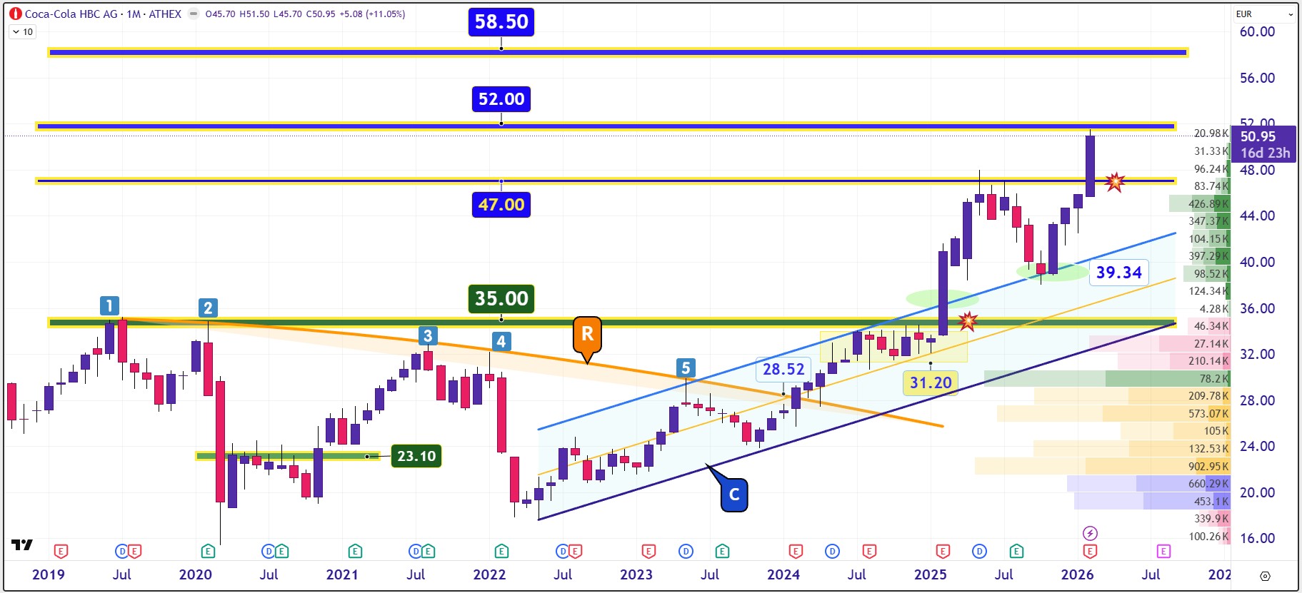 Διαγραμματικά πάντως η μετοχή μετά την ανοδική διάλυση των €47 έχει βρεθεί πάνω στον στόχο των €52. Η πιθανή όμως επιβεβαιωμένη ανοδική τμήση των €52 θέλει ιδιαίτερη προσοχή καθώς θα ανοίξει το πεδίο στους αγοραστές ώστε να κατευθυνθούν πρός την επόμενη ζώνη των €58 με €60 δίνοντας όταν χτυπηθεί μια κεφαλαιοποίηση της τάξης των €22,4 δισ.