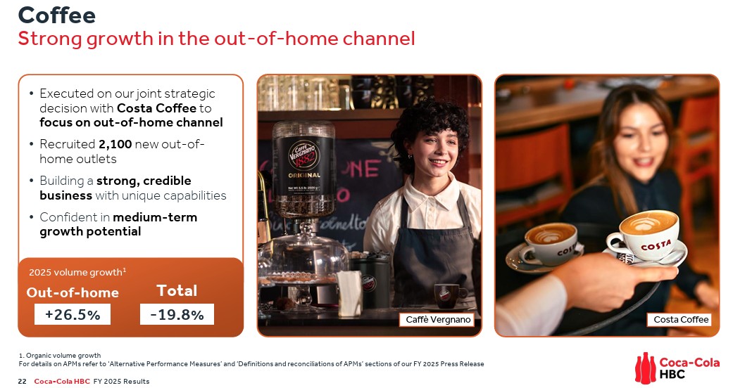 Ο καφές στο out-of-home channel αποτελεί τον τρίτο κρίσιμο άξονα. Παρά τη μείωση του συνολικού όγκου καφέ κατά 19,8%, οι πωλήσεις στο out-of-home κανάλι αυξήθηκαν κατά 26,5%, με 2.100 νέα σημεία. Η επιλογή αυτή ενισχύει την αξία ανά συναλλαγή και ανεβάζει την ποιότητα των εσόδων, ακόμη κι αν περιορίζει την ποσότητα. Το ίδιο μοτίβο εμφανίζεται και στα premium spirits, όπου οι όγκοι αυξήθηκαν 12,2%, στηρίζοντας περαιτέρω το μείγμα.