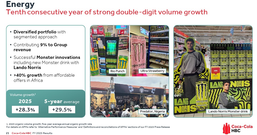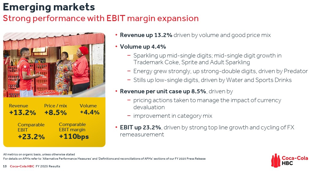 Η πρώτη ουσιαστική ένδειξη βρίσκεται στη γεωγραφία του EBIT. Οι αναδυόμενες αγορές συνεισέφεραν το 2025 €735 εκατ. συγκρίσιμου EBIT, αυξημένο κατά 23,2% σε οργανική βάση, με περιθώριο 13,5%, έναντι 11,8% την προηγούμενη χρήση. Πρόκειται για τη μεγαλύτερη απόλυτη και σχετική βελτίωση σε όλο τον όμιλο. Με έσοδα €5,45 δισ., η περιοχή αυτή απορροφά πλέον σχεδόν το 47% των πωλήσεων και παράγει πάνω από το 54% των λειτουργικών κερδών. Αυτό το στοιχείο αλλάζει τον τρόπο με τον οποίο πρέπει να διαβάζεται η Coca-Cola HBC καθώς το κέντρο βάρους της κερδοφορίας μετακινείται εκτός των παραδοσιακά ώριμων αγορών.