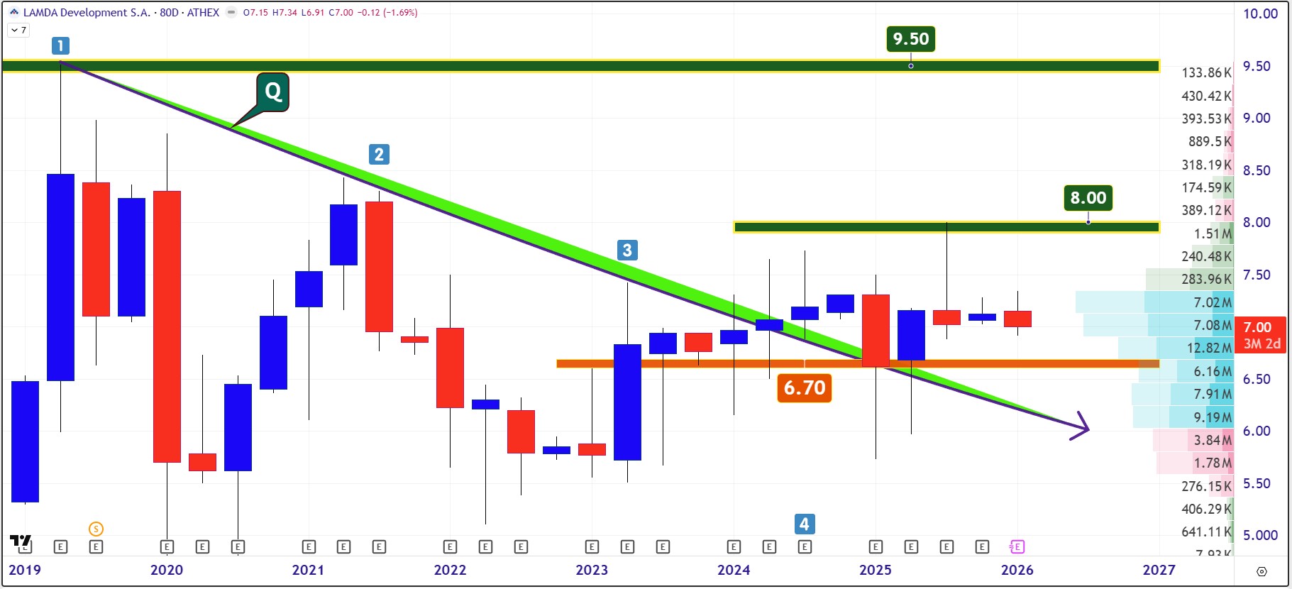 Η μακροπρόθεσμη διαγραμματική ανάλυση δείχνει εδώ και 140 μέρες μια απίστευτη συσσώρευση γύρω από τον άξονα των €7 που δεν δικαιολογείται από τα θεμελιώδη δεδομένα της Lamda. Μια συσσώρευση όμως που έχει όλα τα τεχνικά εχέγγυα να εξελιχθεί σε έκρηξη ανοδικής ορμής πρός την περιοχή των €8,70 με €9,00.