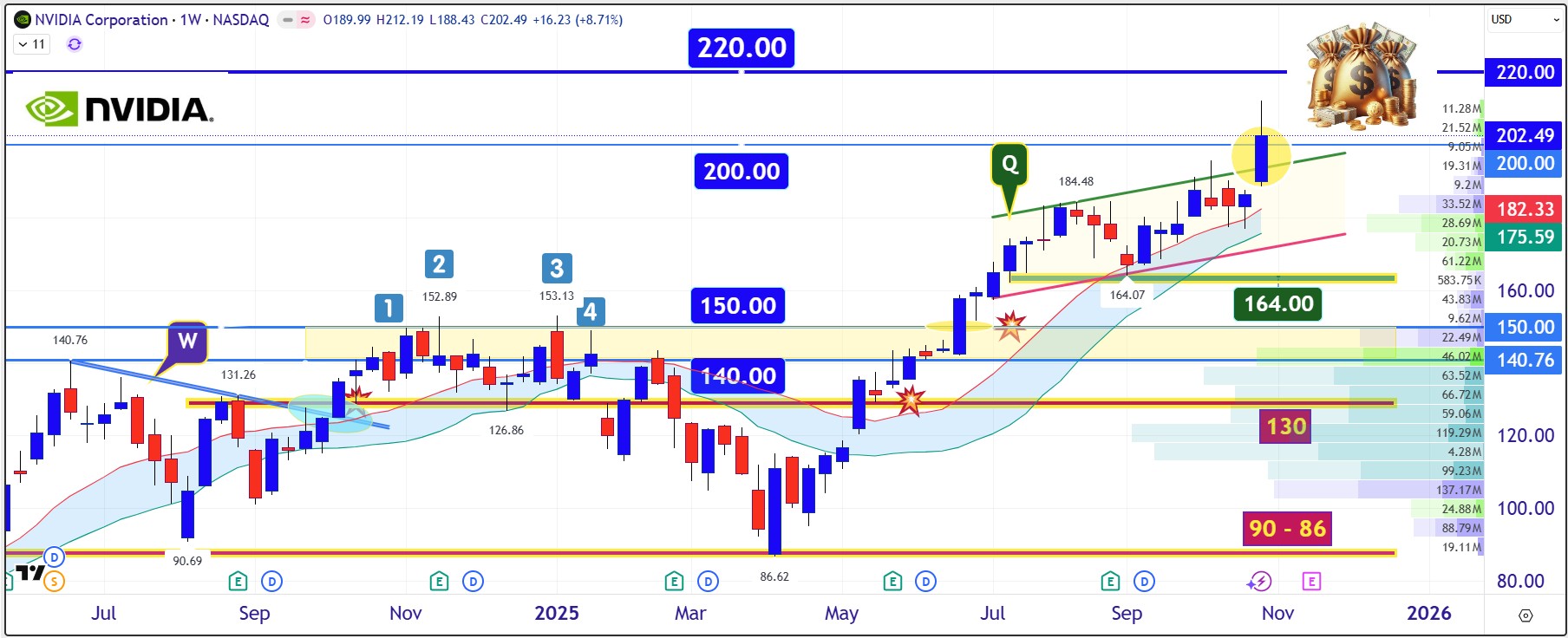 Η αύξηση της αποτίμησης της Nvidia συμπίπτει με ένα τεχνικό σκηνικό «ωστικής κίνησης»: διαγραμματικά, η μετοχή εμφάνιζε ένα ανοδικό κανάλι “Q” που διασπάστηκε, ώθησε την τιμή πάνω από τα $200, και πλέον στοχεύει τα $240, με το αμυντικό όριο να τοποθετείται γύρω στα $165-170. Σε αυτό το περιβάλλον, το στρατόπεδο των Bulls βρίσκει ισχυρό έρεισμα.