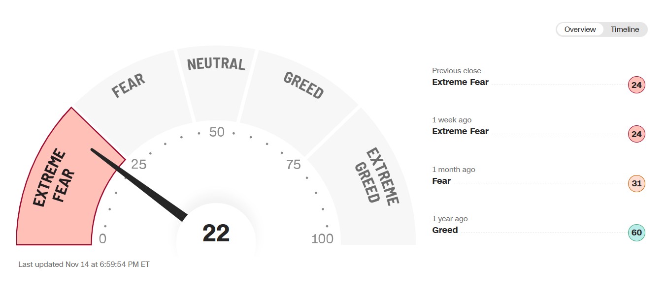 Ίσως για αυτό ο γνωστός δείκτης Fear & Greed του CNN Business δε λέει να ξεκολλήσει από την περιοχή του “Fear” και “Extreme Fear” εδώ και πόσες συνεδριάσεις τώρα, παρά το γεγονός ότι ο S&P 500 βρίσκεται μόλις λίγα τετράγωνα απόσταση από τα ιστορικά του υψηλά. Στο τέλος της συνεδρίασης της Παρασκευής βρισκόταν μέσα στην περιοχή του “Extreme Fear” στο 22.