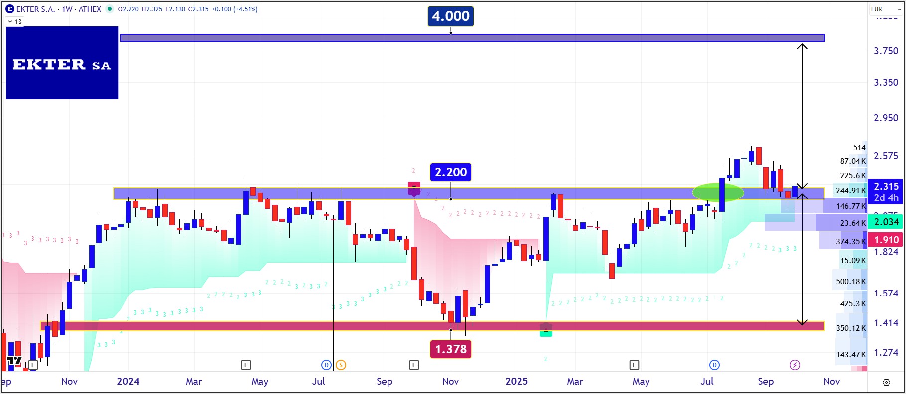 Διαγραμματικά η μετοχή δείχνει να πατά πάνω από τα €2,20 με €2,00 χτίζοντας μια ισχυρή βάση αγοραστών για τα €4,00.