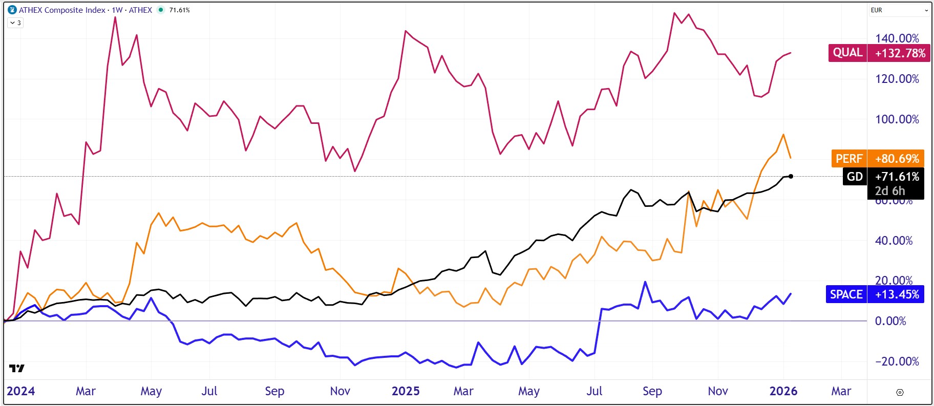Στο διάγραμμα από τις αρχές του 2024 έως σήμερα καταγράφεται μια έντονη υστέρηση που δεν συμβαδίζει με τα μεγέθη. Η μετοχή της Space Hellas εμφανίζει σωρευτική άνοδο περίπου +13,5%, όταν η Performance Technologies κινείται στο +80,7%, η Quality & Reliability στο +132,8%, ενώ ο Γενικός Δείκτης του ATHEX Euronext βρίσκεται στο +71,6%.