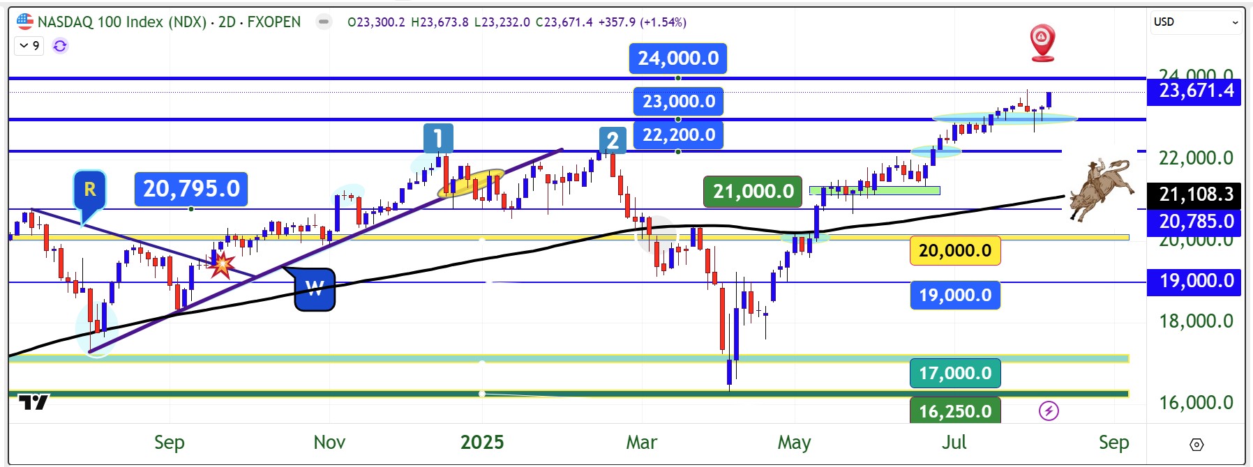 Οι βασικοί κινητήριοι μοχλοί αυτής της δυναμικής είναι οι τεχνολογικές εταιρείες με τον δείκτη τους τον Nasdaq 100 να σπάει το ένα ρεκόρ μετά το άλλο. Έτσι από διαγραμματικής απόψεως όσο κρατάει τη βάση των 23.000 μονάδων θα ανοίγει το έδαφος για τις 24.000 μονάδες.