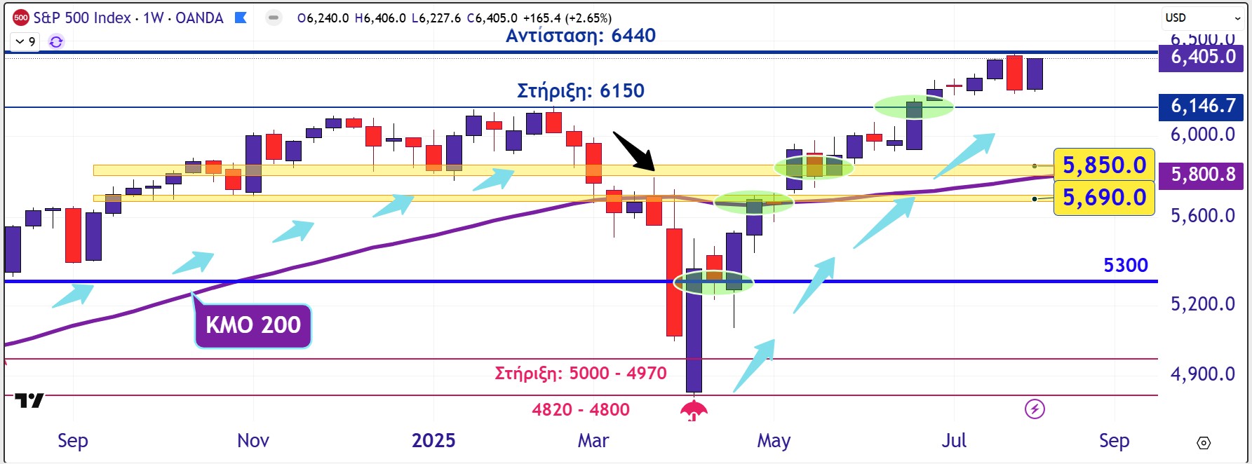 Η αγορά δείχνει ισχυρή, αλλά και γεωμετρικά ασύμμετρη με τον S&P 500 να θέλει να διορθώσει κατεβαίνοντας προς την περιοχή στήριξης των 6.150 μονάδες αλλά να μην μπορεί.
