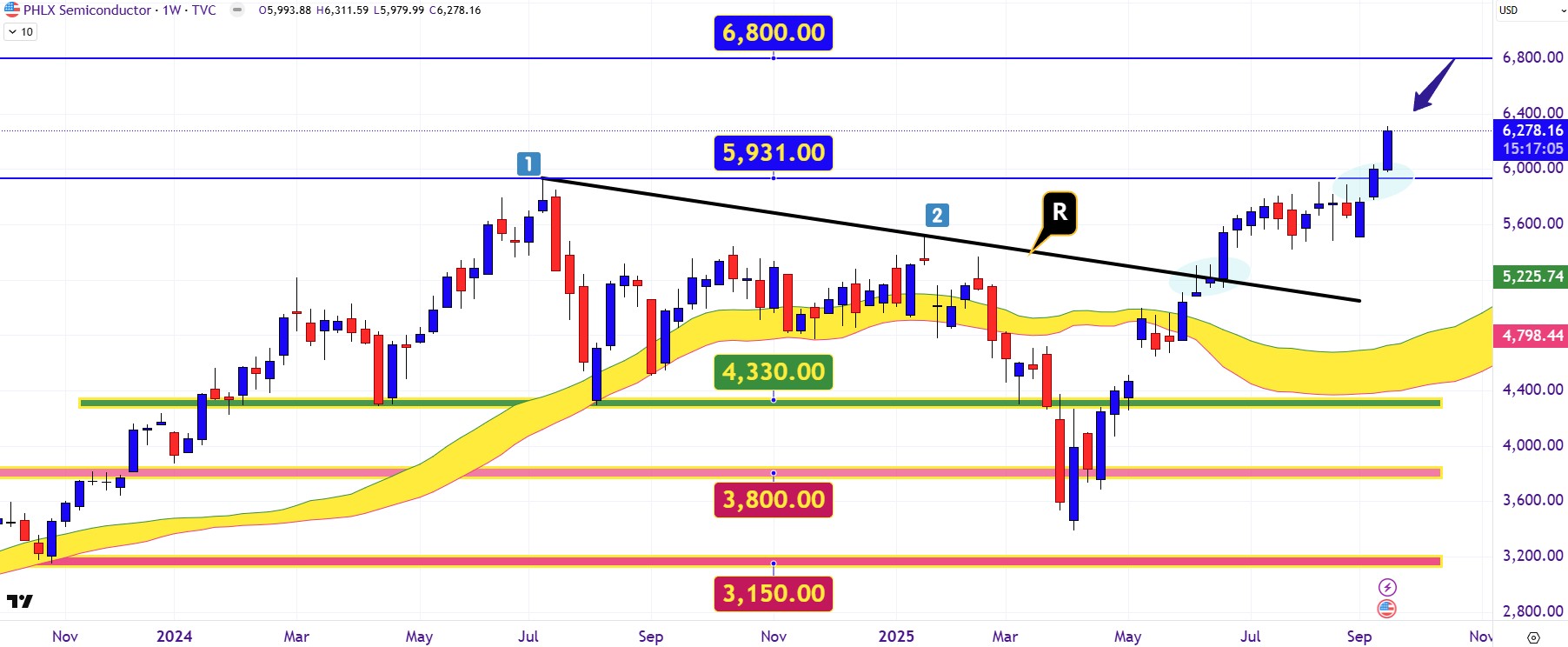 Ο PHLX Semiconductor Sector (SOX) έχει ξεπεράσει όλες τις προσδοκίες, καταγράφοντας νέα ιστορικά επίπεδα και προσελκύοντας έντονο επενδυτικό ενδιαφέρον. Με την τιμή του να έχει ανέβει πάνω από τις 6.300 μονάδες — ξεπερνώντας την κορυφή των 5.931 μοναδικών μονάδων του Ιουλίου 2024 — ο δείκτης αποτυπώνει ότι η αγορά των ημιαγωγών βρίσκεται σε φάση επιτάχυνσης. Οι συναλλαγές είναι έντονες, το momentum ισχυρό, και οι επενδυτές φαίνεται να ποντάρουν αποφασιστικά στην επέκταση της τεχνητής νοημοσύνης, των data centers και της γενικότερης υπολογιστικής υποδομής.