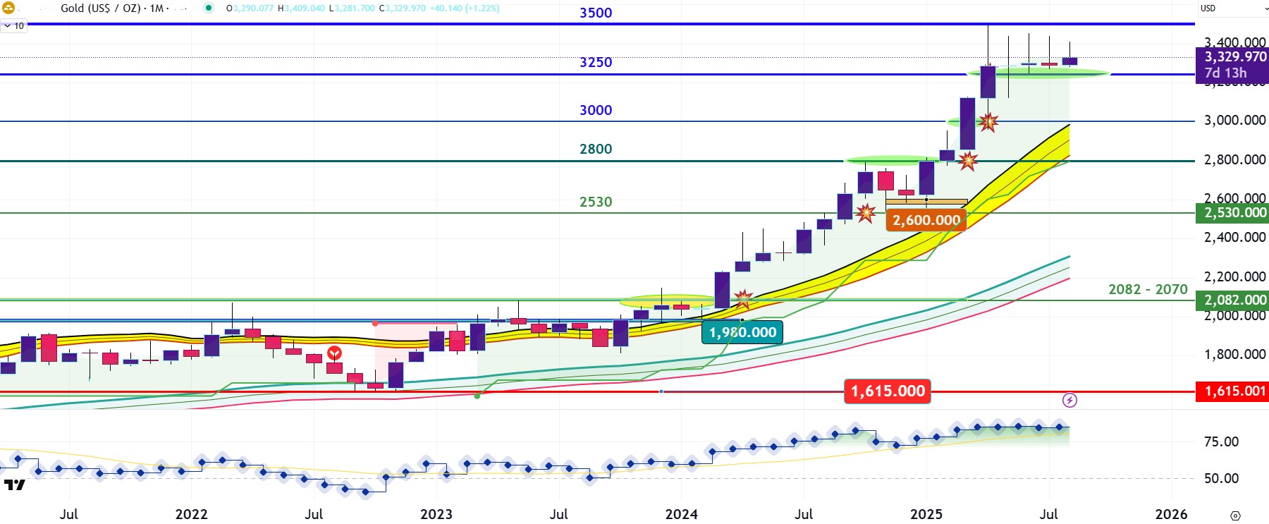 Εδώ, μιας που έχουμε συμβόλαιο, από απόψεως διαγραμματικής ανάλυσης έχει φρακάρει για μεγάλο χρονικό διάστημα λίγο πάνω από τη στήριξη των 3.250 δολαρίων περιμένοντας πιθανότατα την αφορμή για να διασπάσει ανοδικά τα 3.500 δολάρια.