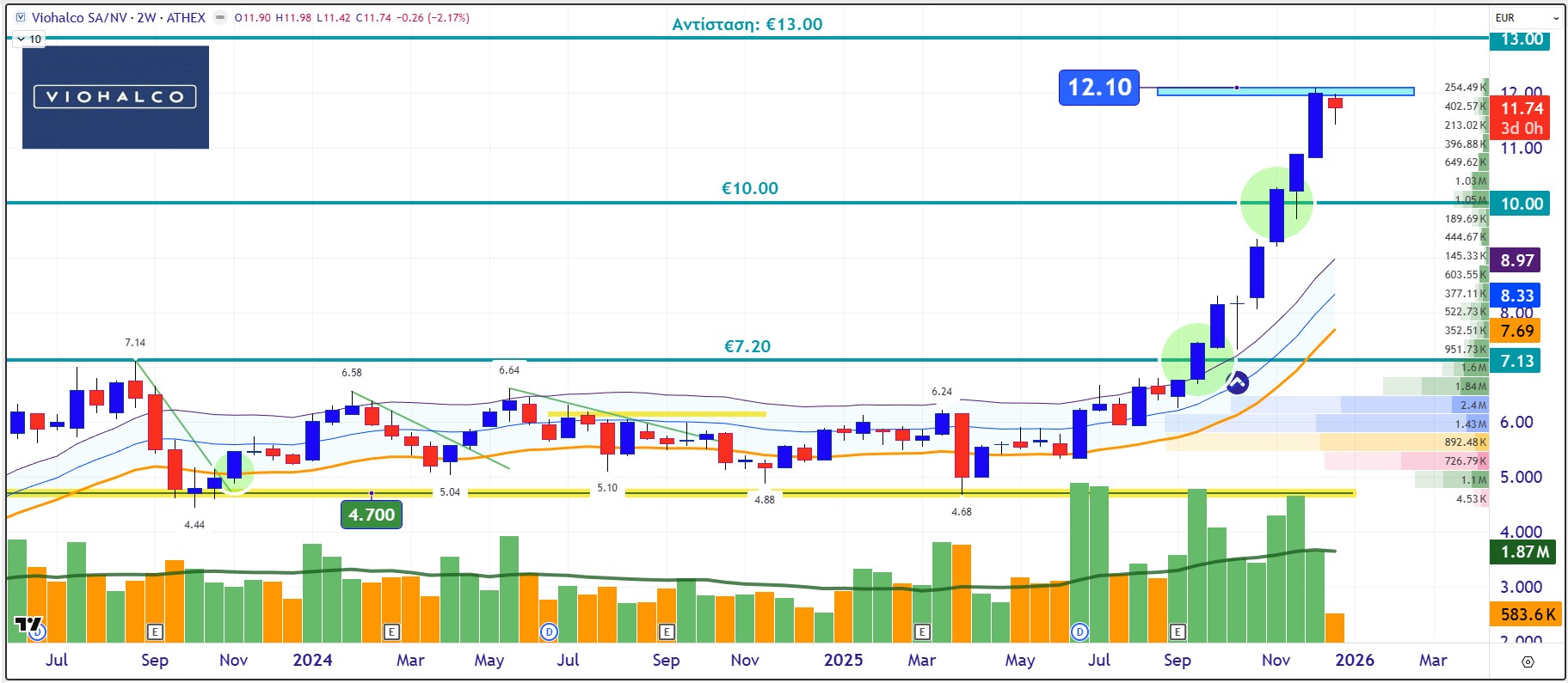 Η μετέπειτα ανοδική διάσπαση και των €10,00 έδωσε τη διαγραμματική λαβή για μεγαλύτερη ανοδική εκτόνωση φτάνοντας μέχρι τώρα έως την περιοχή των €12,00–12,10. Η ζώνη αυτή που μπορεί να λειτουργήσει στο επόμενο βήμα ώς σημείο βραχυχρόνιας ισορροπίας είναι ικανή να φέρει τη μετοχή πάνω από τα €13,00.
