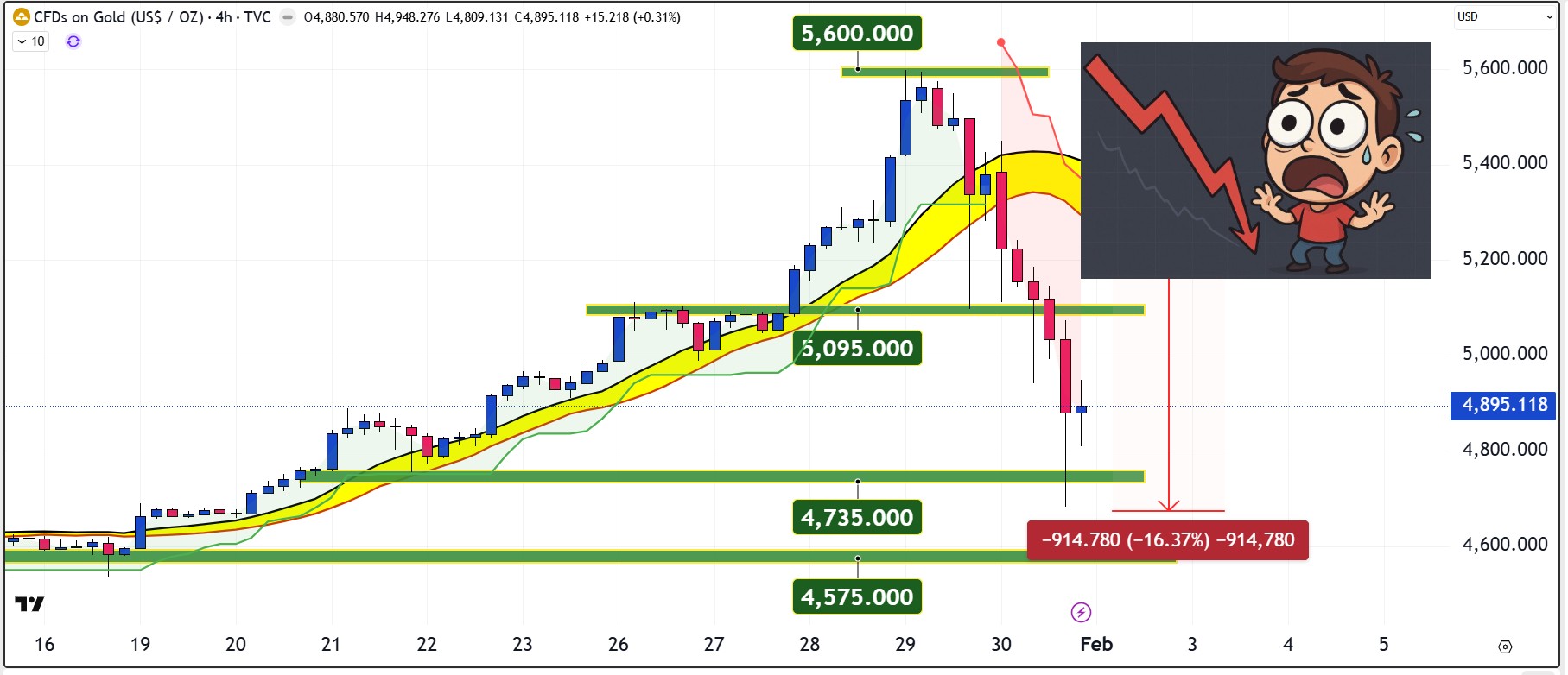 Ο χρυσός βυθίστηκε από τα ιστορικά υψηλά των 5.600 δολαρίων στα 4.682 δολάρια μέσα σε μόλις τρεις συνεδριάσεις, καταγράφοντας μια απίστευτα έντονη διόρθωση της τάξης του -16,37%. Κίνηση η οποία είχε άμεσο αποτύπωμα και στην εκτιμώμενη συνολική αγοραία αξία του χρυσού σε παγκόσμιο επίπεδο.