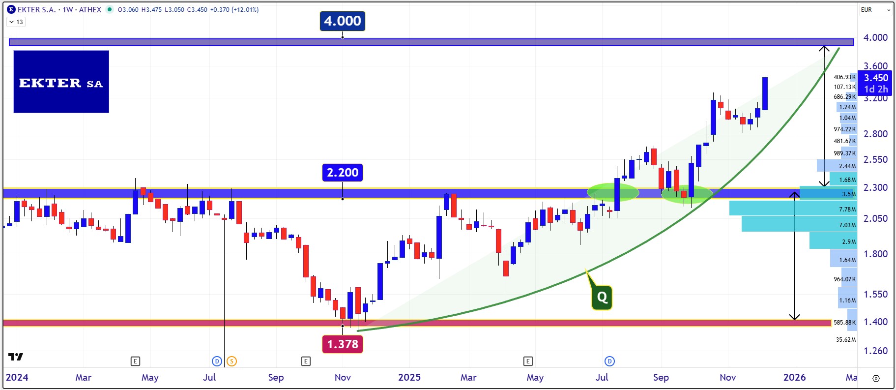Συνολικά, η ΕΚΤΕΡ βρίσκεται σε φάση όπου το λειτουργικό κομμάτι, οι διαγωνισμοί, η τεχνική εικόνα και η μετοχική διάρθρωση κινούνται προς την ίδια κατεύθυνση. Το πέρασμα από τα 2,30 στα 3,45 δεν είναι υπερβολή αλλά αποκατάσταση. Το διάγραμμα πάντως έχει προαποφασίσει την επόμενη στάθμη: η περιοχή γύρω από τα 4,00 ευρώ λειτουργεί πλέον ως προφανής στόχος της αγοράς.